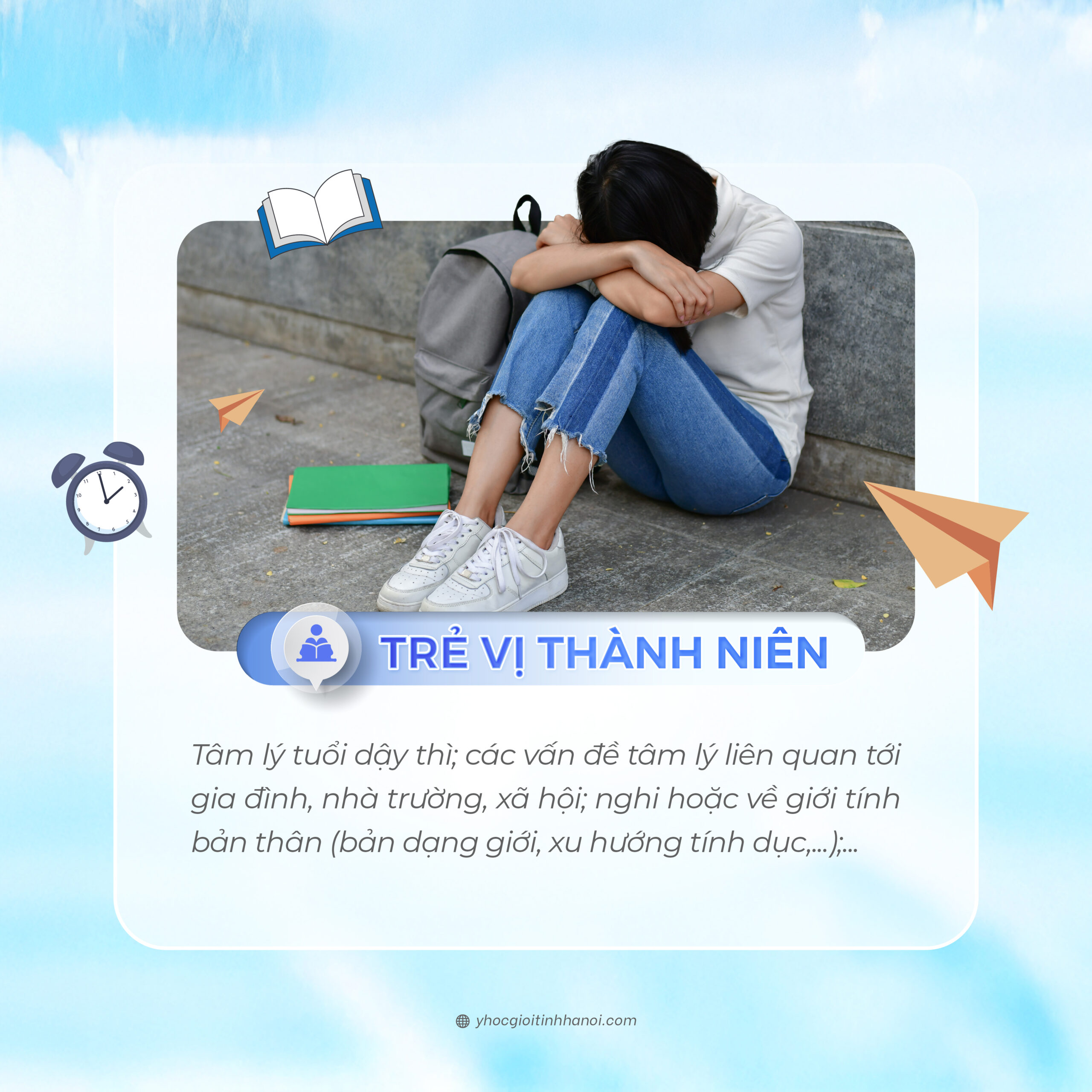 Trẻ vị thành niên: Tâm lý tuổi dậy thì; các vấn đề tâm lý liên quan tới gia đình, nhà trường, xã hội; nghi hoặc về giới tính bản thân (bản dạng giới, xu hướng tính dục,…);…