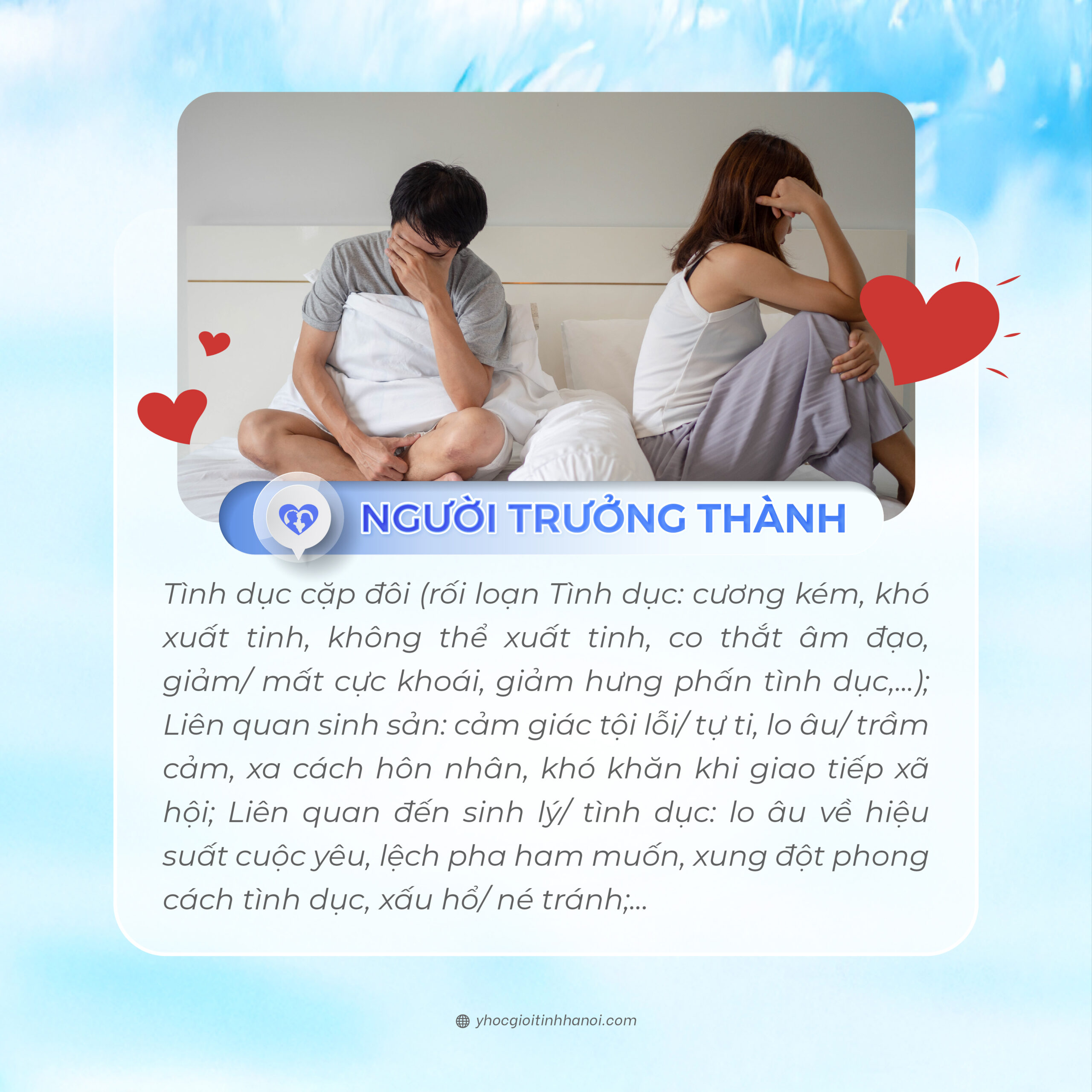 ▪️ Tình dục cặp đôi (Rối loạn Tình dục: cương kém, khó xuất tinh, không thể xuất tinh, co thắt âm đạo, giảm/ mất cực khoái, giảm hưng phấn tình dục,…)